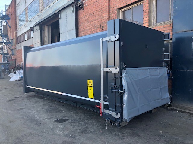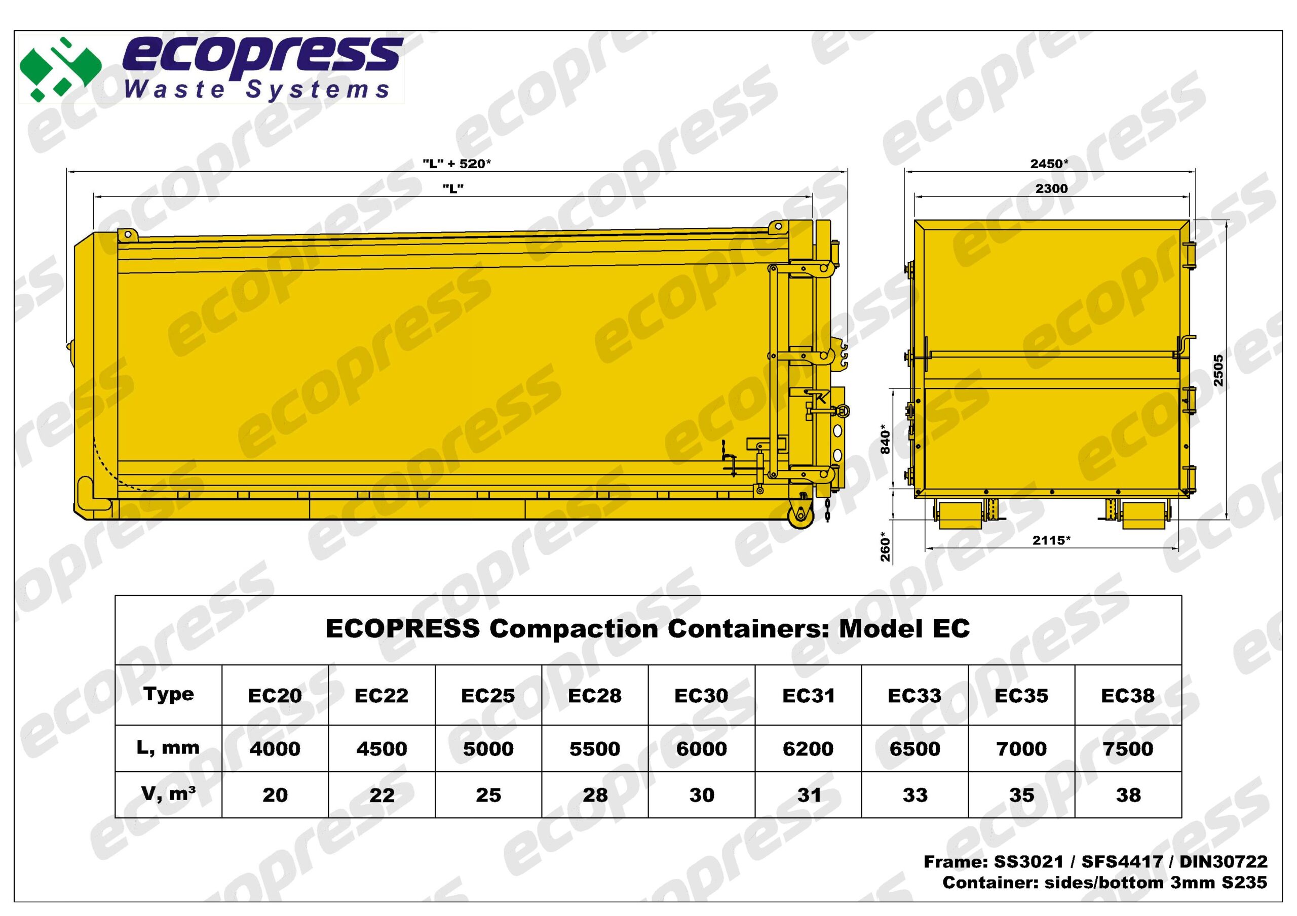 El contenedor de compactación ECOPRESS está diseñado para su uso con compactadoras estacionarias ESC o ETS para comprimir cartón, lámina y residuos municipales secos o semisecos, reduciendo el volumen de residuos almacenados y el costo de su transporte. A diferencia de las compactadoras móviles, donde el proceso de operación se suspende durante el tiempo de vaciado del contenedor, el sistema de compactadoras estacionarias permite organizar un proceso continuo de compresión de residuos. La suspensión del proceso de operación de la compactadora estacionaria ocurre solo durante el cambio de contenedores.