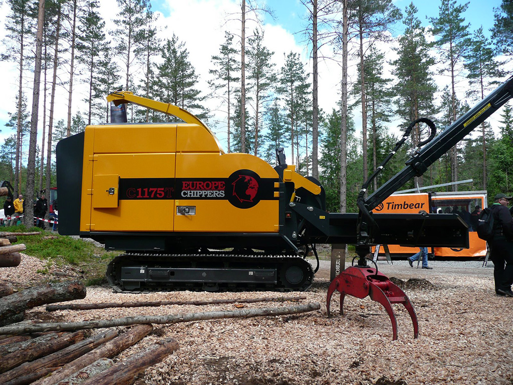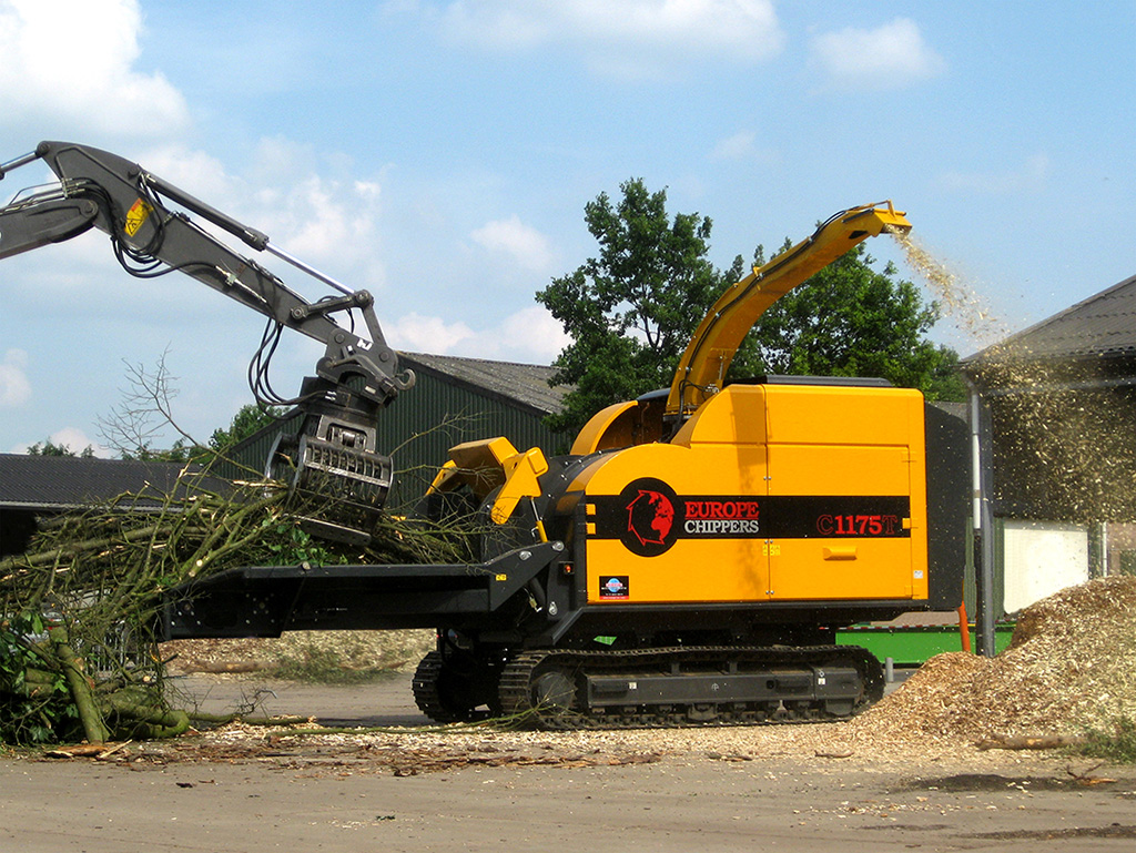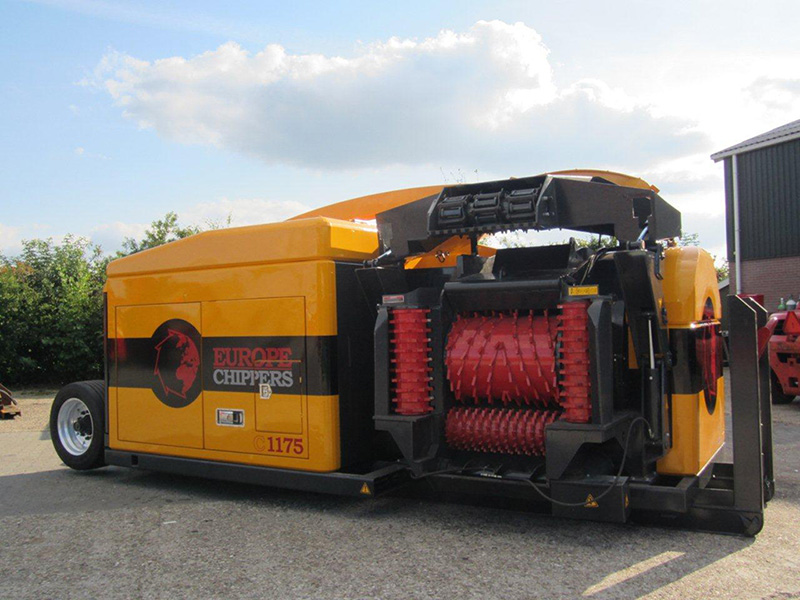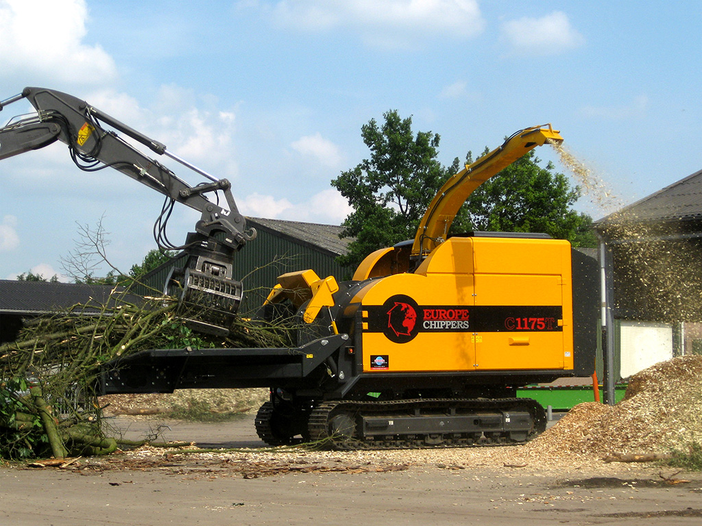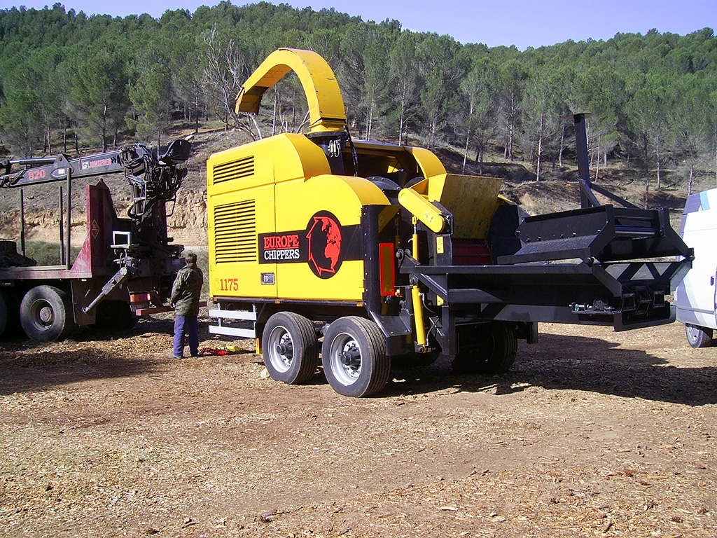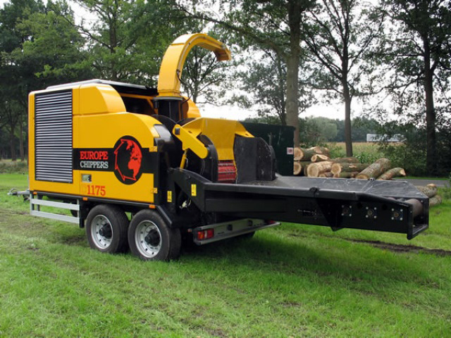 El modelo C-1175, es la astilladora de Europe Chippers más potente de su gama. Sus motores van desde los 500 hasta los 700 CV de potencia en versión diesel Caterpillar, y entre 250 kW y 310 kw en su versión eléctrica con una producción aproximada de 200 m3/h. Por tanto esta astilladora está pensada para triturar una gran cantidad de troncos forestales de hasta 60 centímetros de diámetro.
