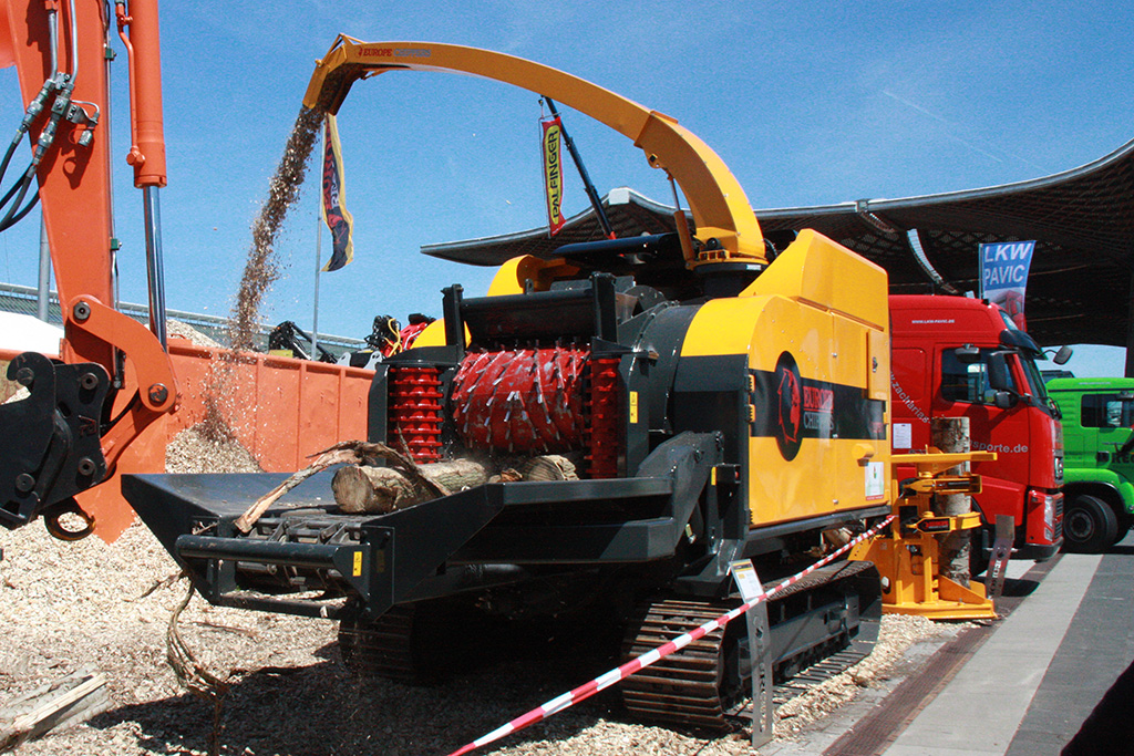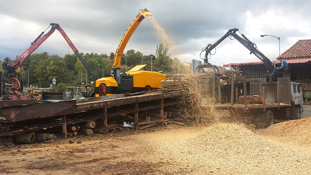 En pocos segundos los troncos de más de 4 metros de longitud son triturados, sacando por su tolva y con gran fuerza, la astilla de unos 70 mm aproximadamente.