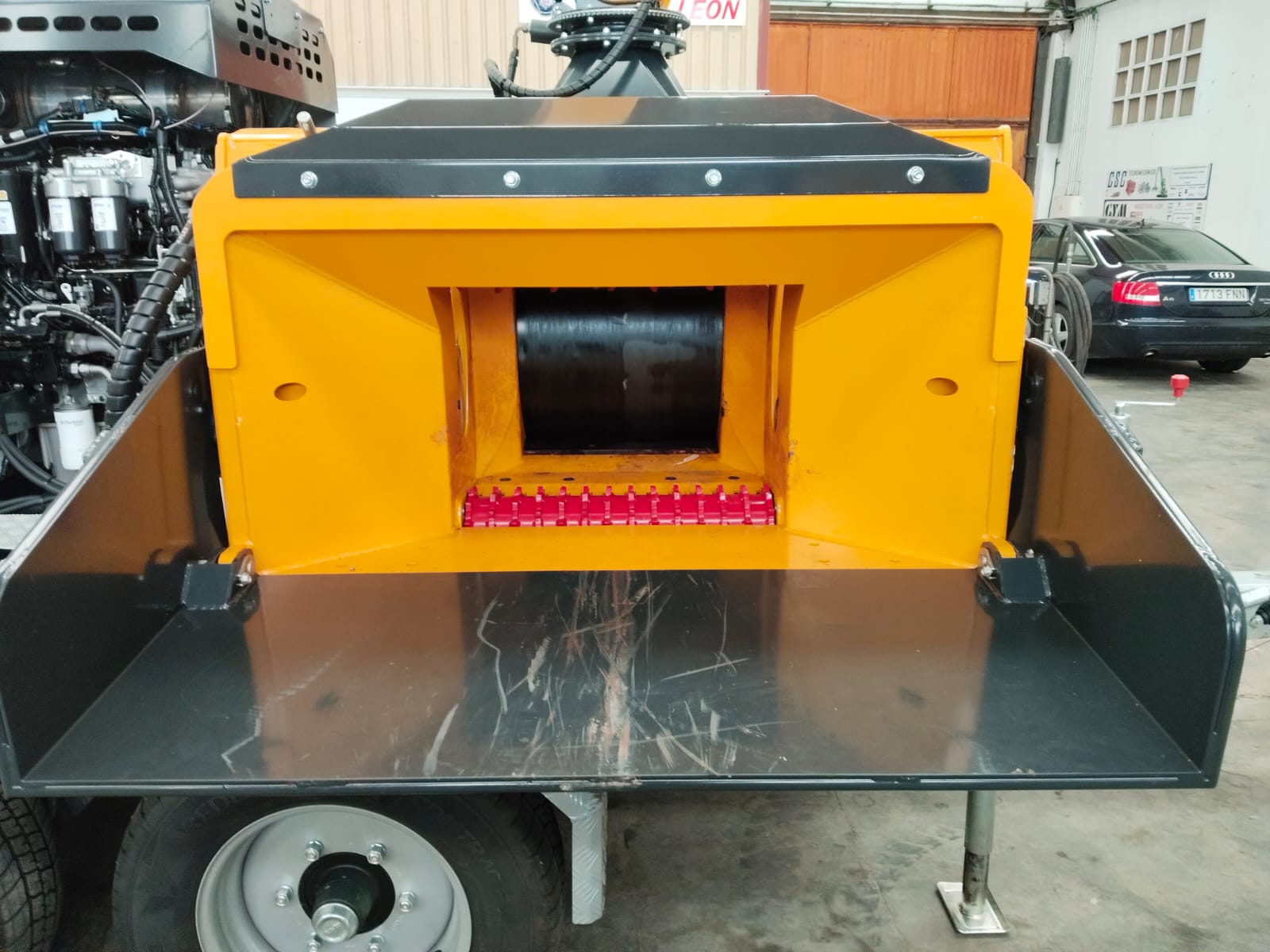 La astilladora o picadora para troncos modelo EC 640 tiene el mejor diseño compacto. Con un motor de 200 CV y con menos de 10L de Diesel la hora, saca una producción de hasta 70 m3/h.