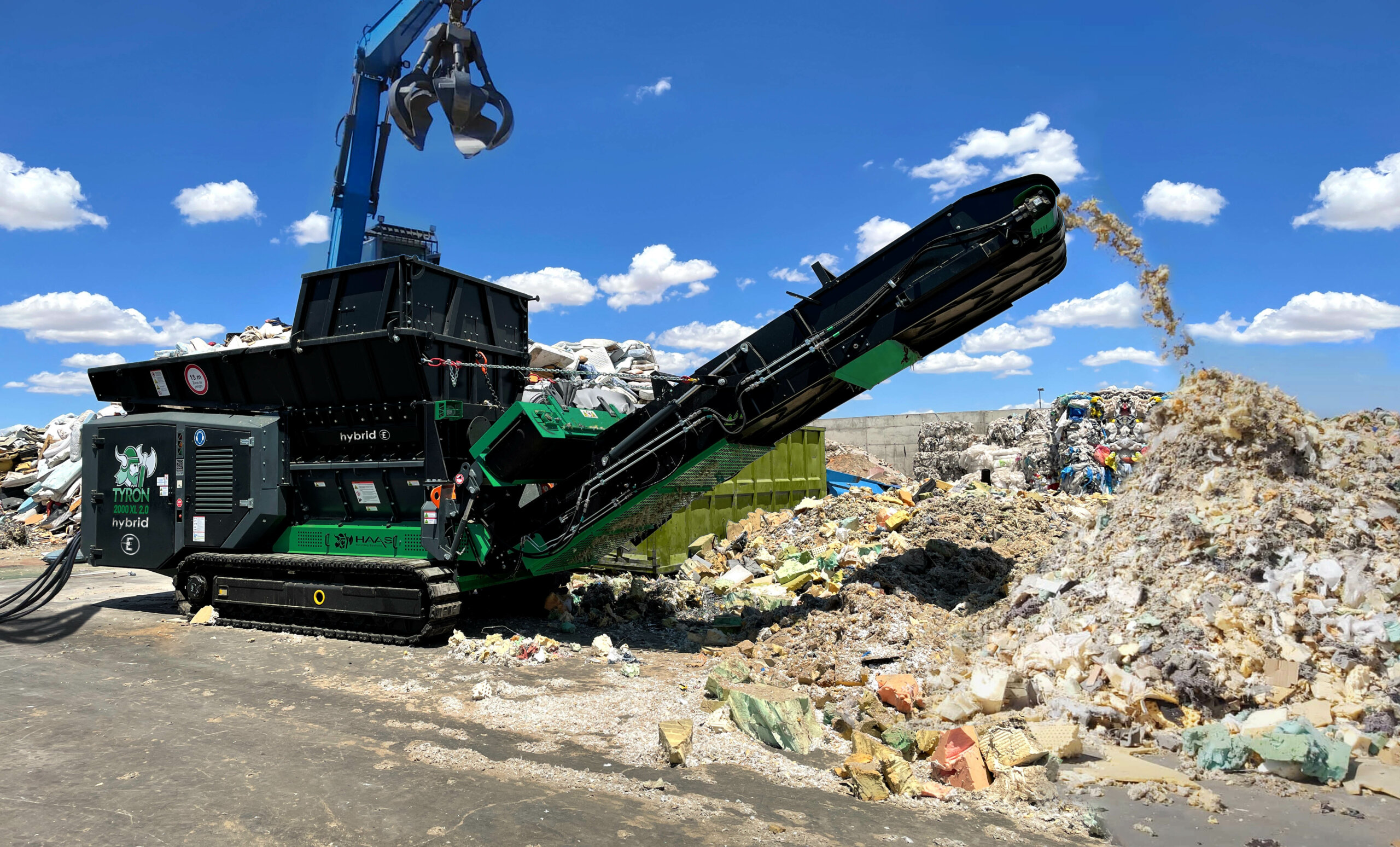 La nueva versión híbrida de la trituradora primaria TYRON complementa la gama de productos HAAS con una versión móvil y eléctrica. El robusto triturador primario de dos ejes TYRON 2000 XL 2.0 híbrido cuenta con una unidad principal con 280 kW para el proceso de trituración. El generador diesel proporciona 43 kW para mover la pista de rastreadores.